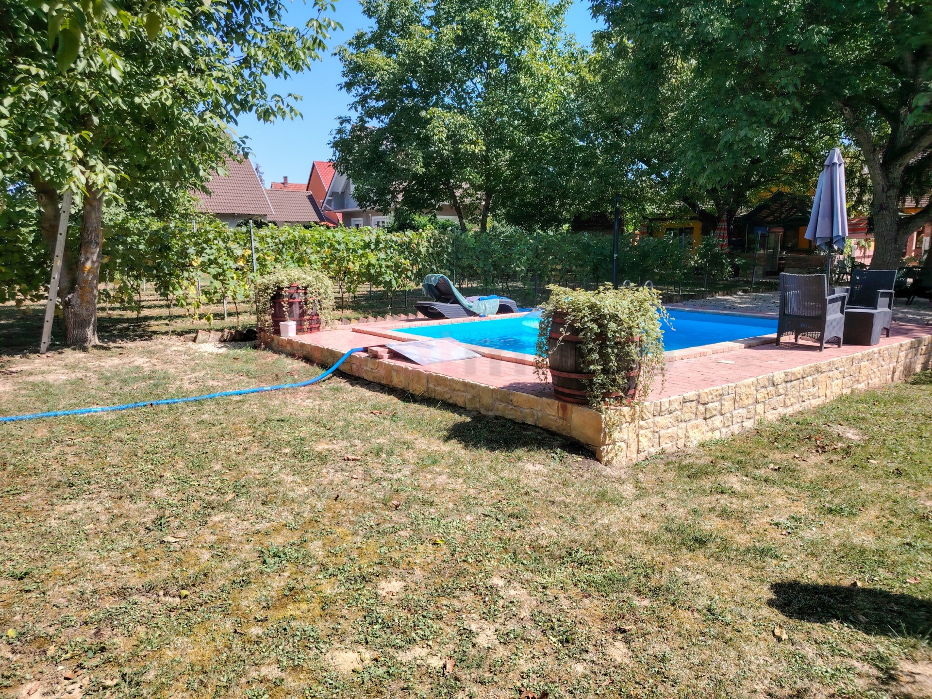 A rendkívül igényesen kialakított közel 2400 m2-es parkosított területen árnyas fák alatt szabadtéri kemence, bográcsozó és grillező helyek, borozó pavilon mellett egy komplett automata vízforgató és tisztító berendezéssel felszerelt 6 méteres épített medence is várja új tulajdonosait és vendégeiket. Még egy téglából épített kedves galambdúc is díszíti a bejáratot.