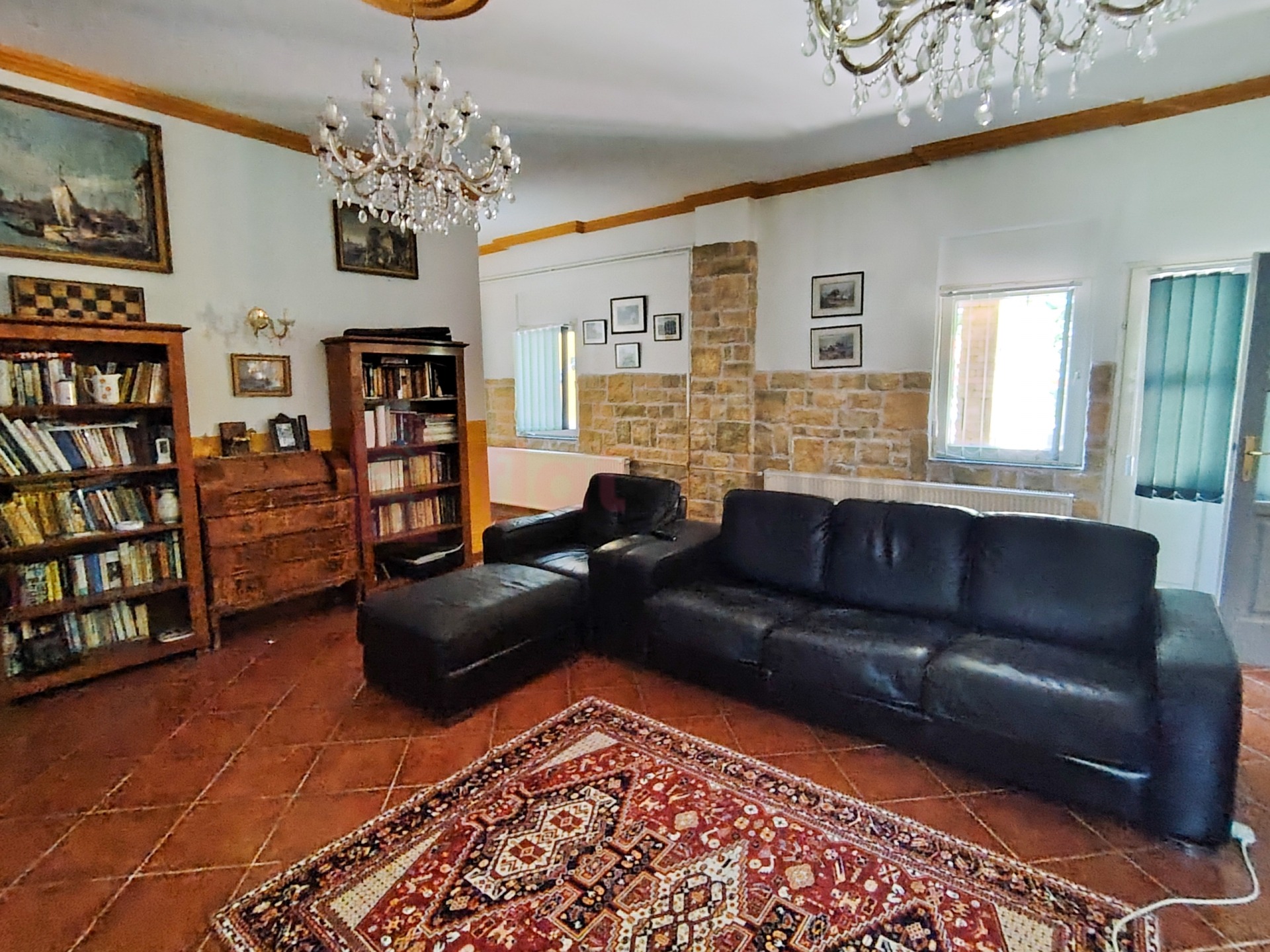 Harkányban eladó egy 320 m2-es lakóház. Az épület egyik fele egy családias hangulatú, nagymérető nappaliból és 3 szobából álló lakás, mely akár családi élettérként, akár kiadásra ideális. Berendezése is egy nagypolgári lakás stílusát és eleganciáját követi. Az impozáns belső terek bútorai, szőnyegei, festményei, dísztárgyai, mind ezt a hangulatot sugallják, kiegészülve azonban a korszerű kényelmet biztosító technikával, minden szobában televízióval, hűtővel, internet csatlakozással.