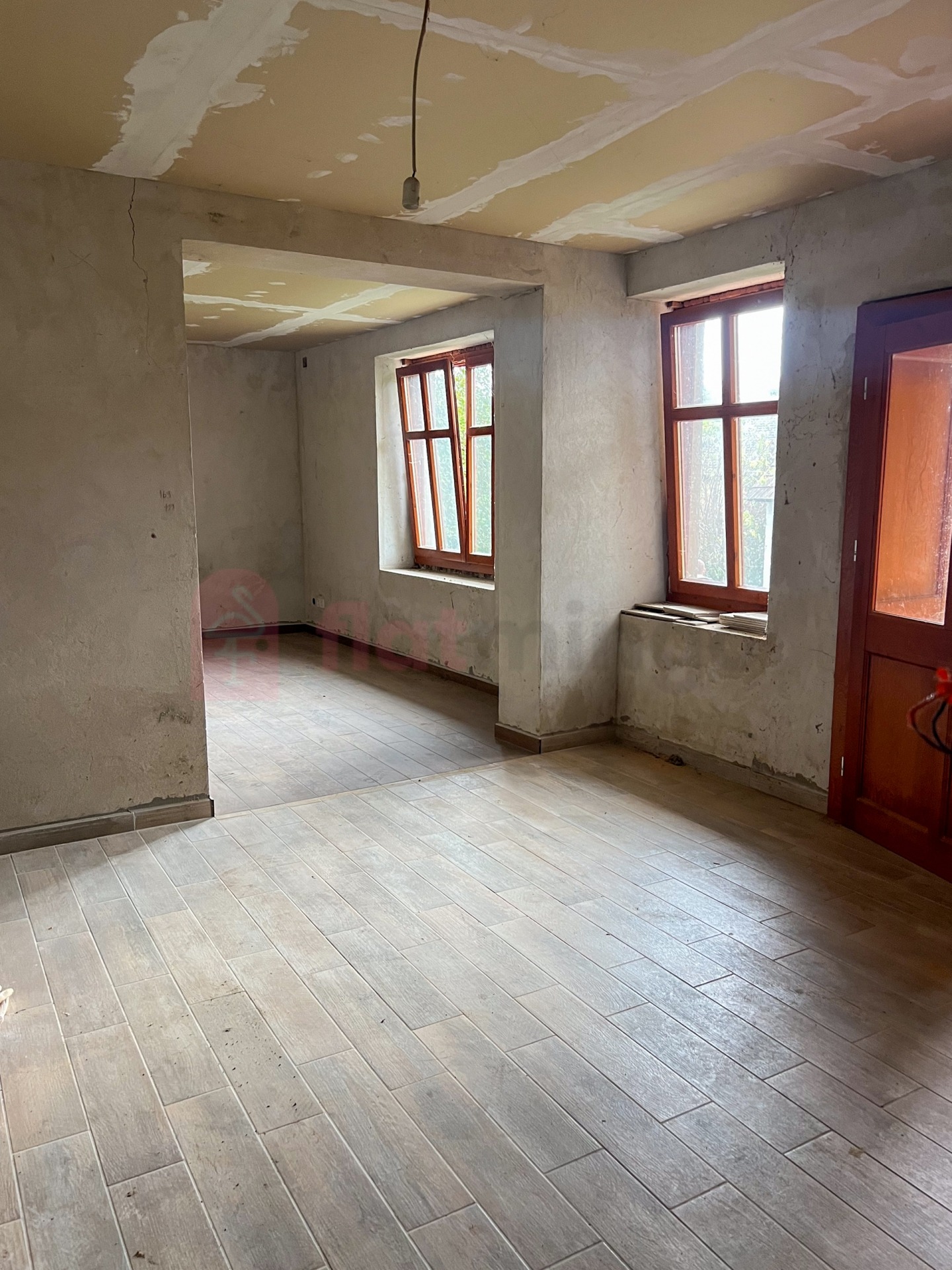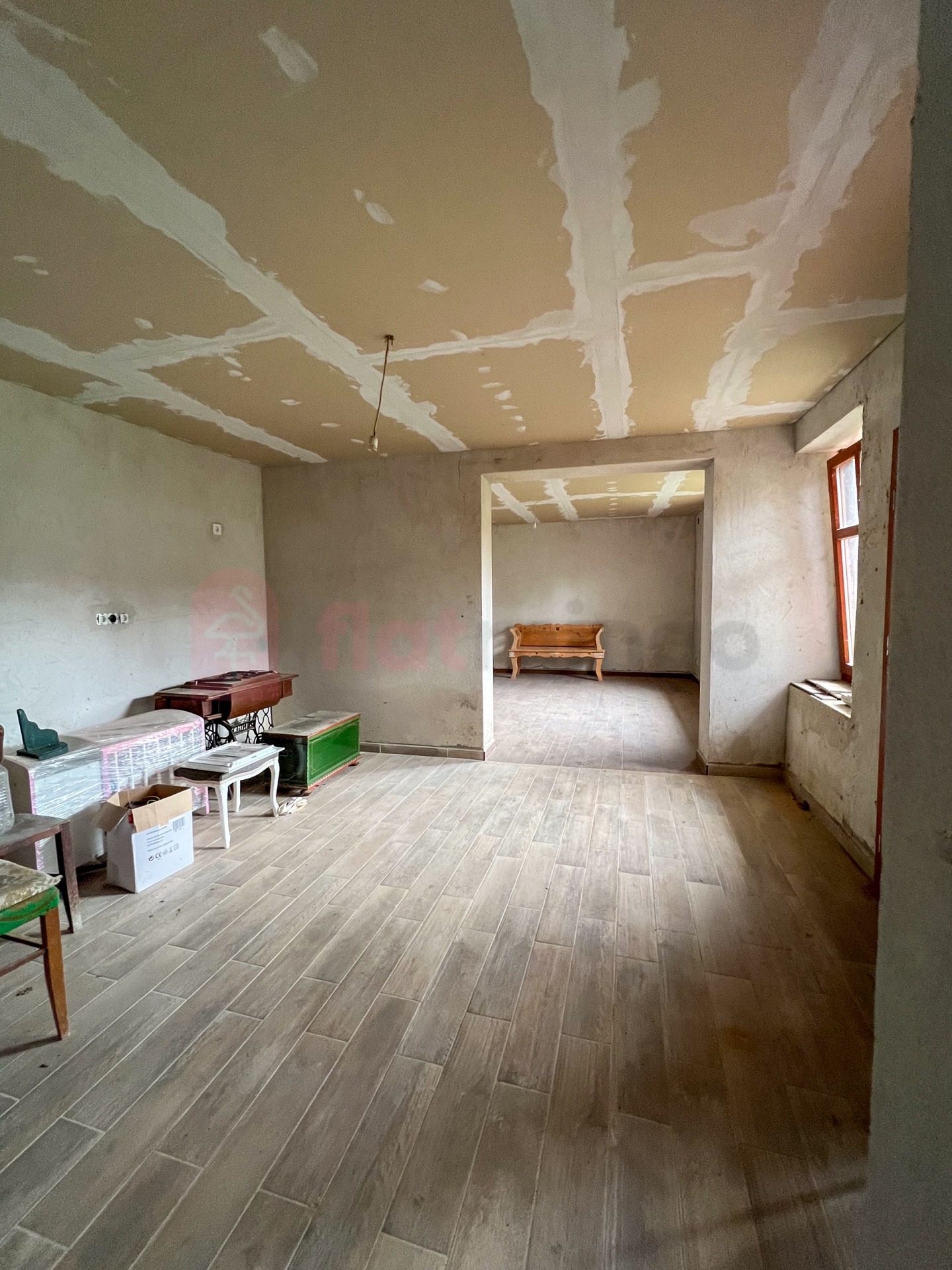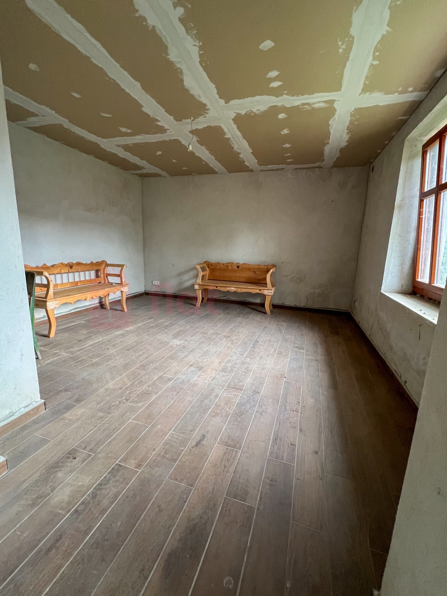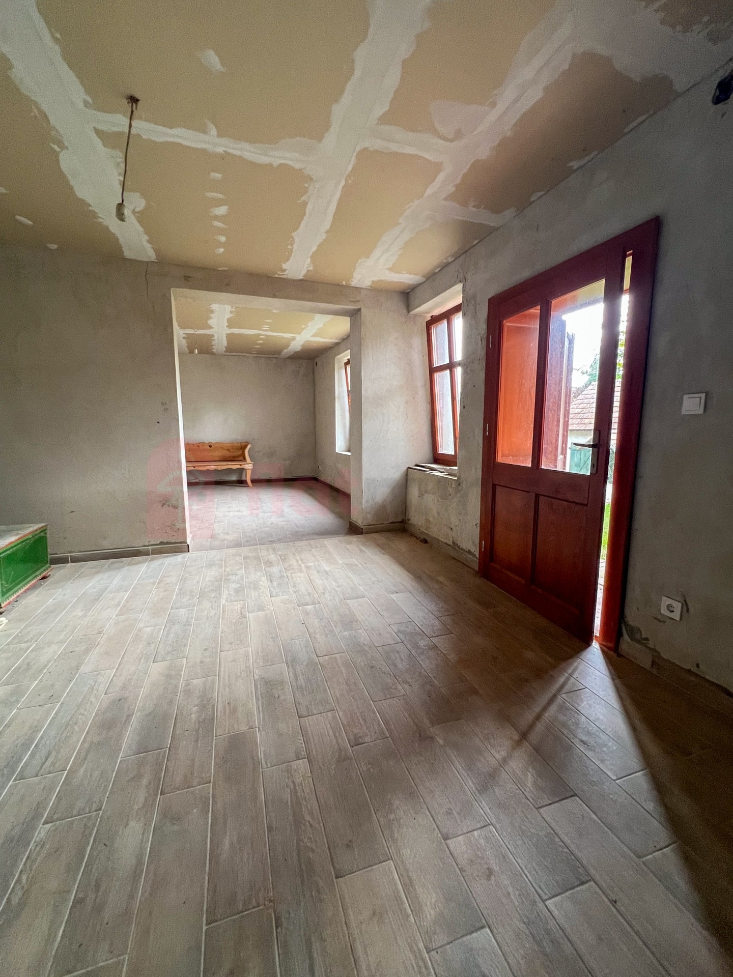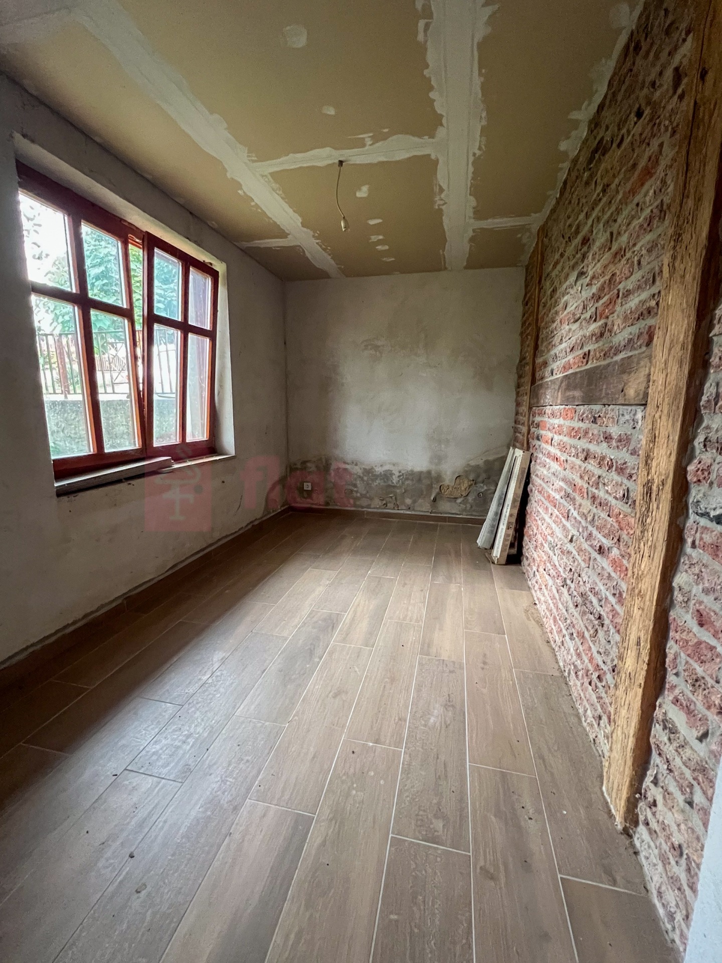Belső felújítás megkezdve: új hidegburkolat, épített zuhanyzó, gipszkartonozás Jó állapotú tető, stabil szerkezet