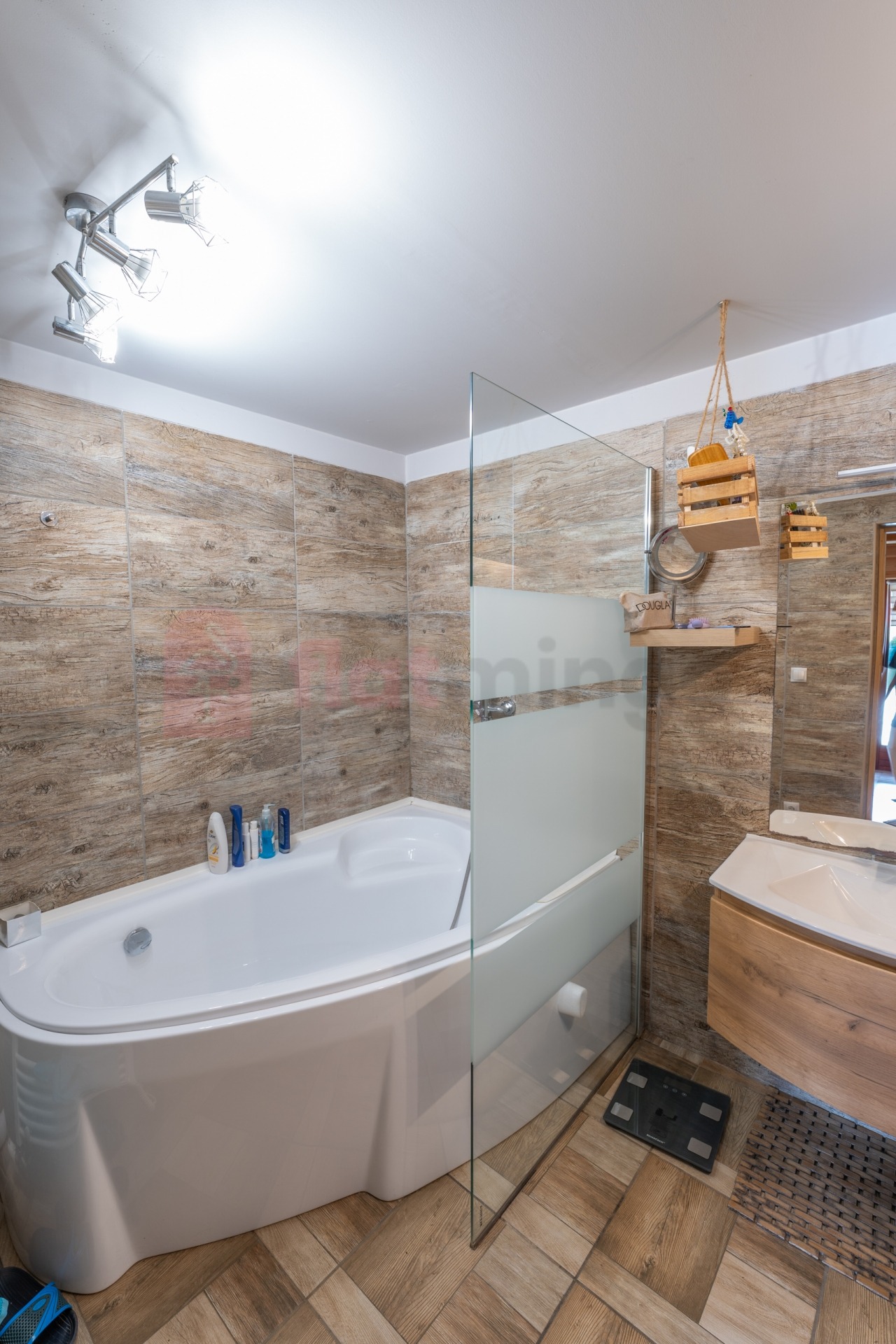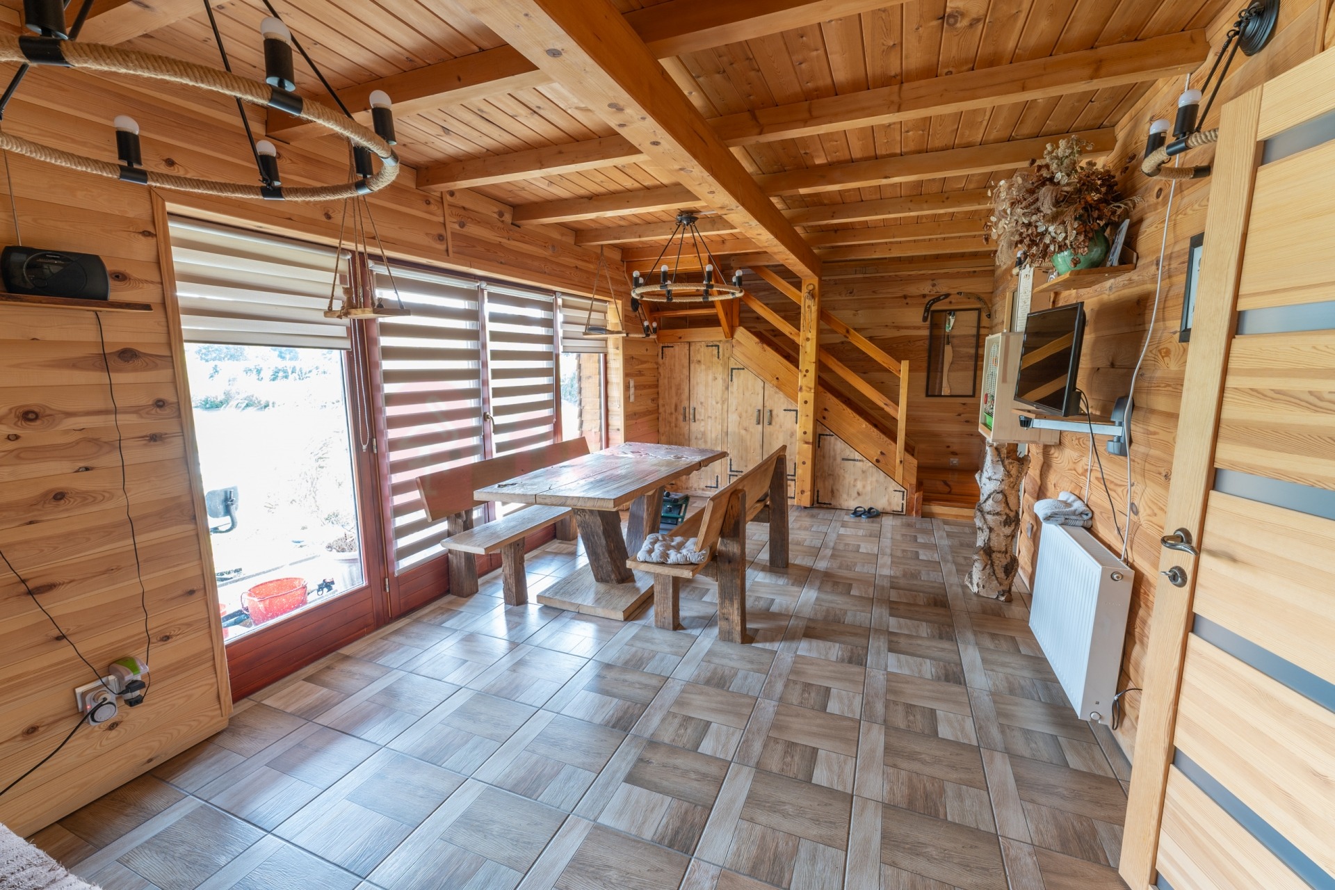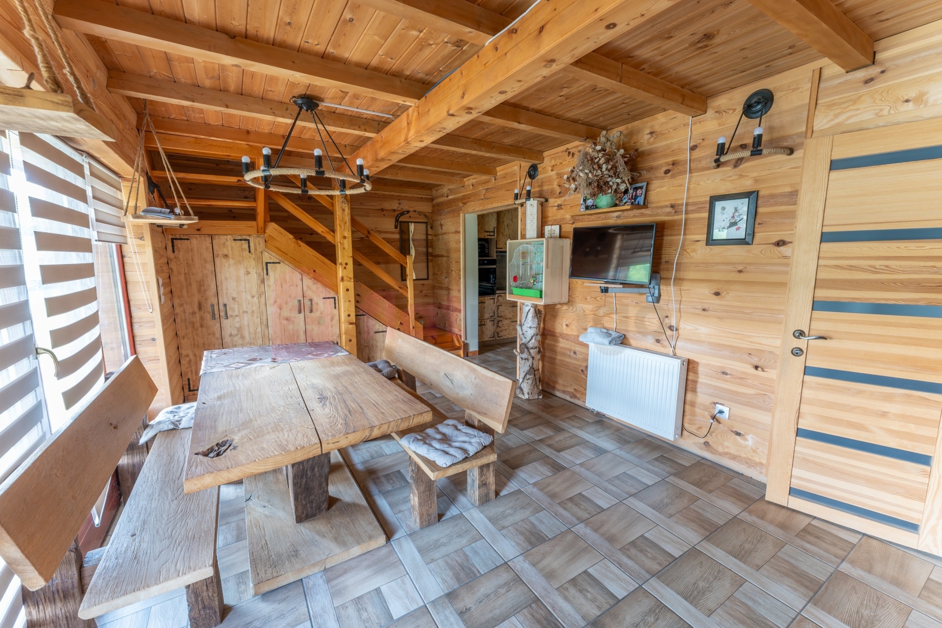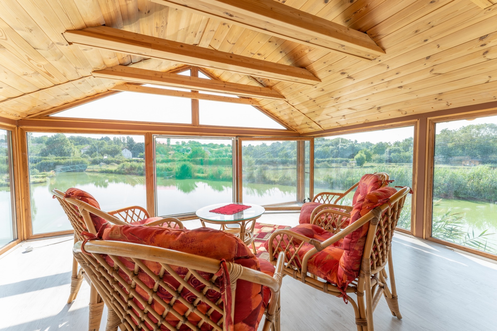 A belső két szintes épület 3 és fél szobás, bruttó 119 m2 (nettó 95 m2) alapterületen. Különlegessége a tó fölé kinyúló, körben üvegezett, panorámás télikert.