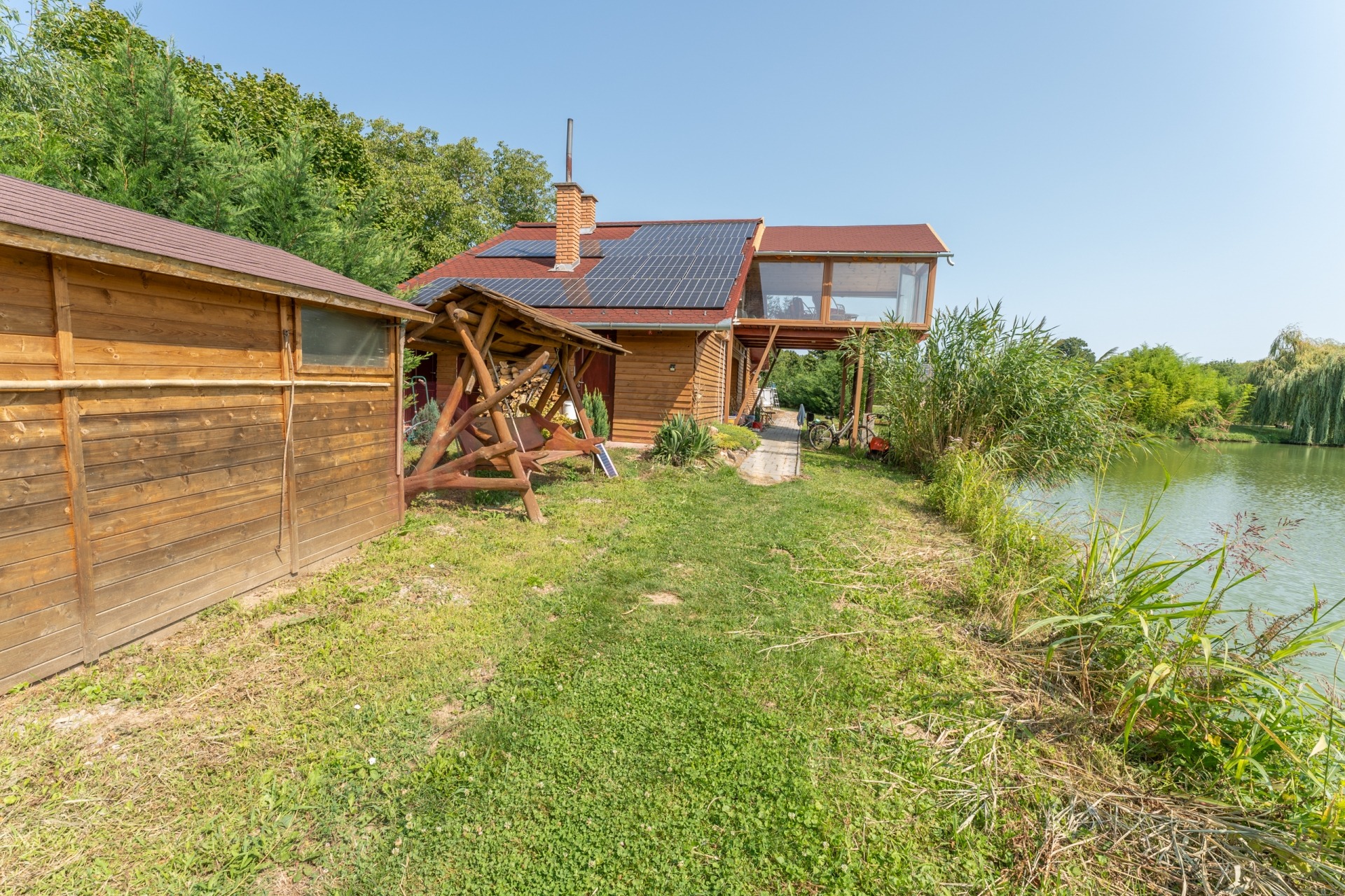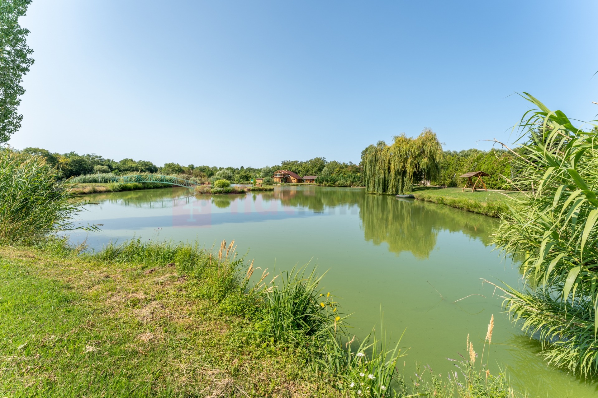 Közel 2 hektár területen, két saját horgásztóval, gondozott parkkal körülvett egyedi, exkluzív kialakítású nyaraló eladó.